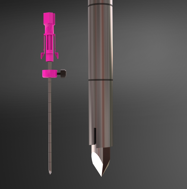 The OmniBone™ biopsy kit is also a coaxial system. It combines an introducer and a biopsy needle. Once the introducer is in place, the inner part of the introducer is removed and the biopsy needle is inserted in the cannula allowing multiple biopsies to be performed while using the same access.