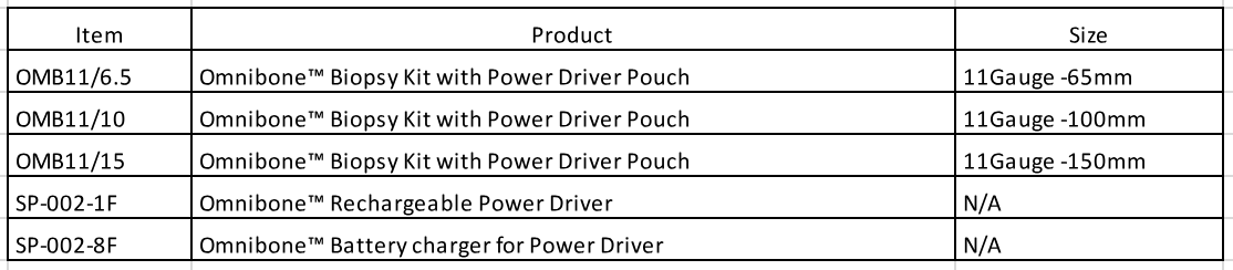 The OmniBone™ biopsy kit with Power Driver is available in 11 Gauge and three lengths (6.5 cm, 10 cm, 15 cm).